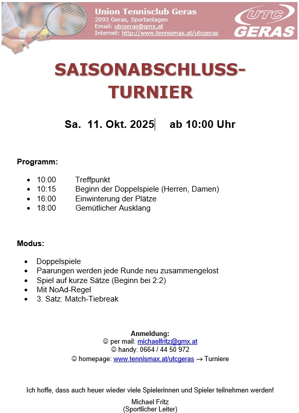 Von 15. - 17.8.2025 veranstaltet der UTC Geras seine Vereinsmeisterschaften wieder als offenes Turnier.